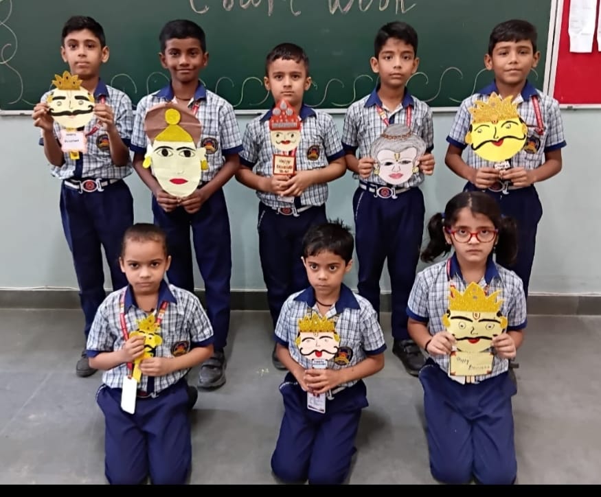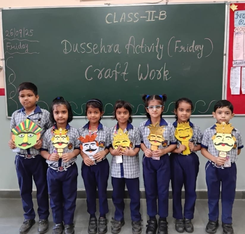 Our school organized a small activity on the occasion of Dussehra to make the students aware of the importance of the festival and to enhance their creative skills.Students of Preschool participated in creative tearing and pasting activity, Students of Pre Primary made beautiful mask on characters of Ramayana, Students of Class I and II prepared beautiful crafts related to the festival such as Ravana masks and colourful decorations.The activity was conducted in the classrooms with great enthusiasm and participation from all students.